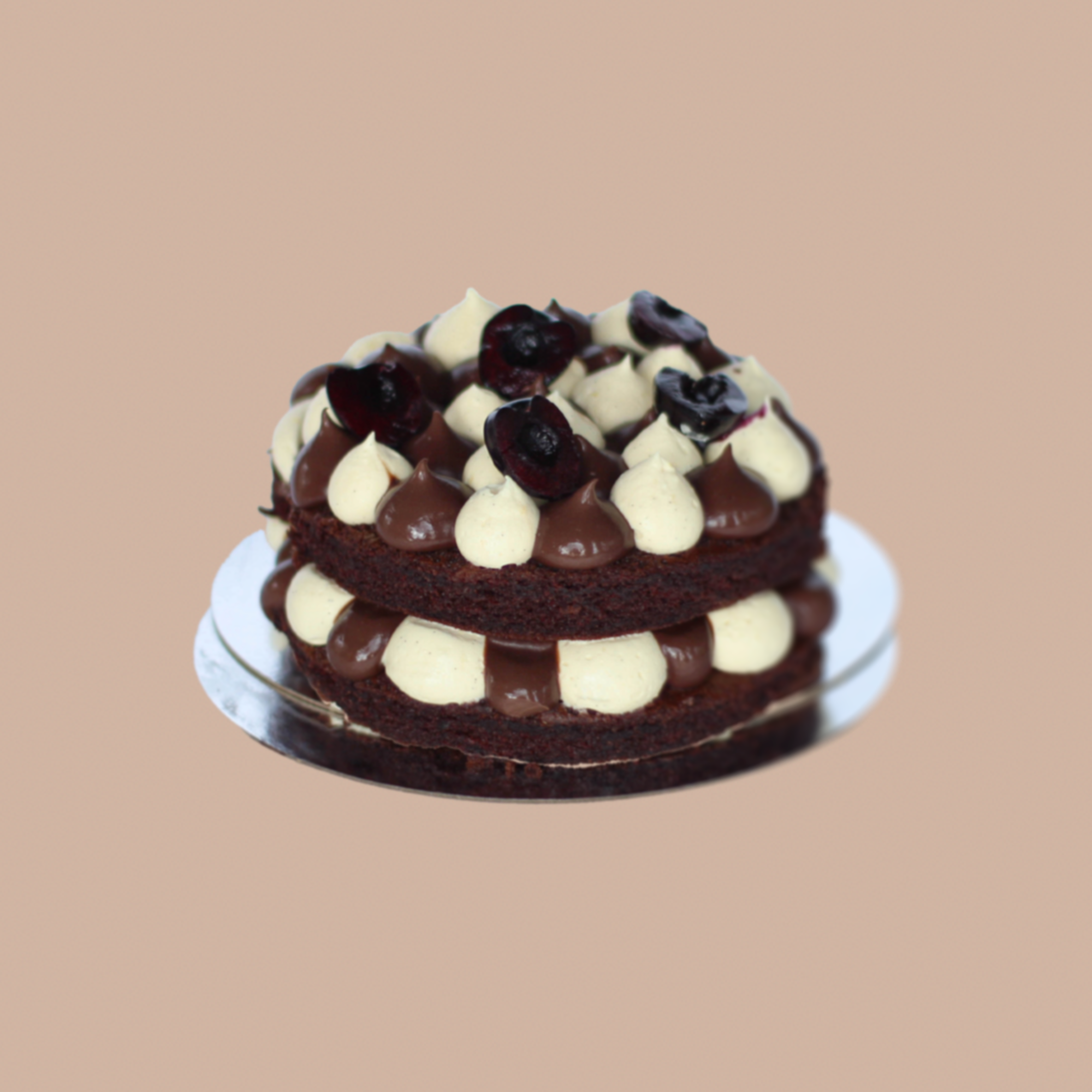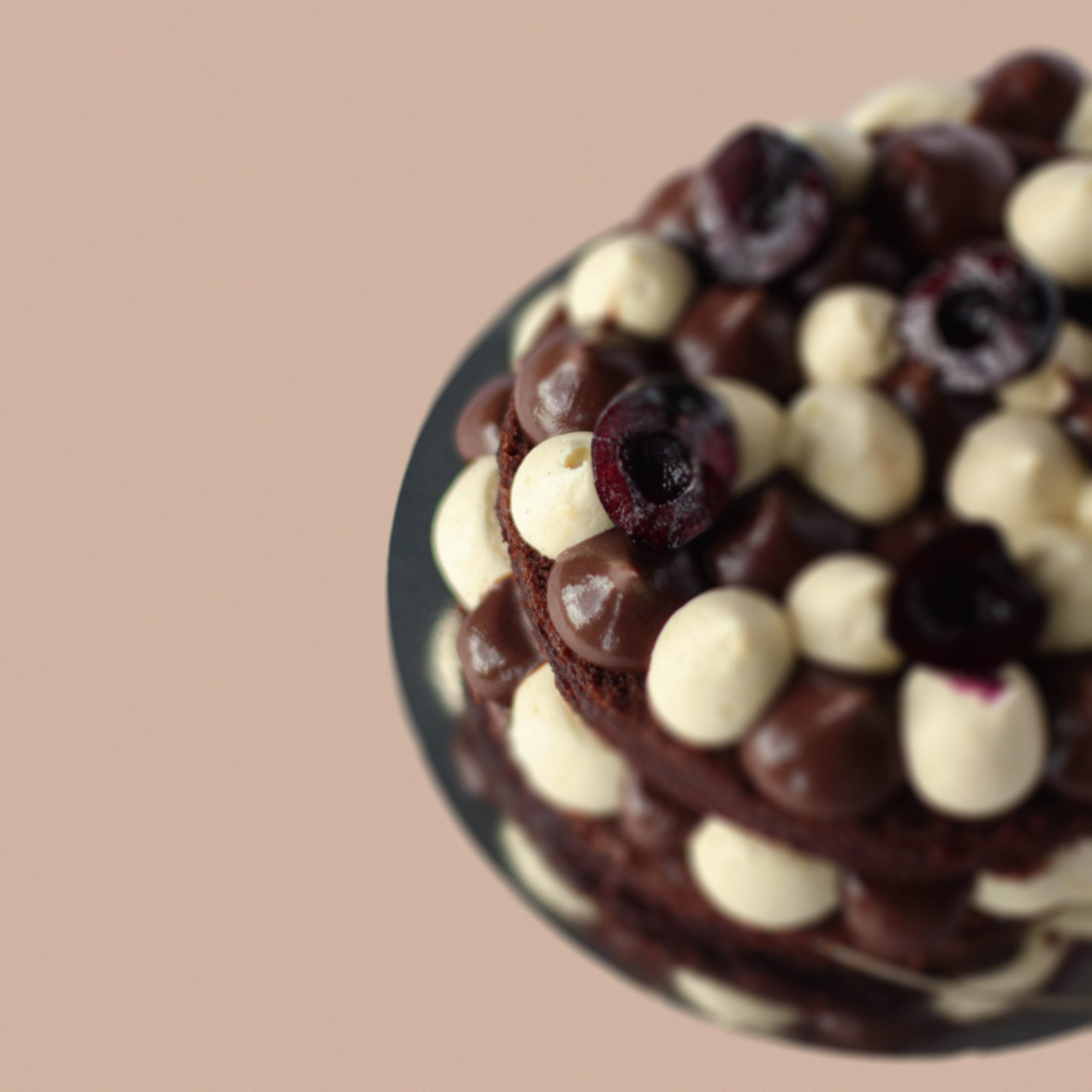 My take on the classic Black Forest combines a moist chocolate sponge layered with silky white chocolate ganache and rich chocolate pastry cream. A luscious maraschino cherry compote adds a burst of tartness, while fresh cherries (when in season) crown the cake with a bright, natural sweetness. This version blends indulgence and balance, creating a dessert that feels both luxurious and fresh—perfect for those who love a refined twist on tradition.