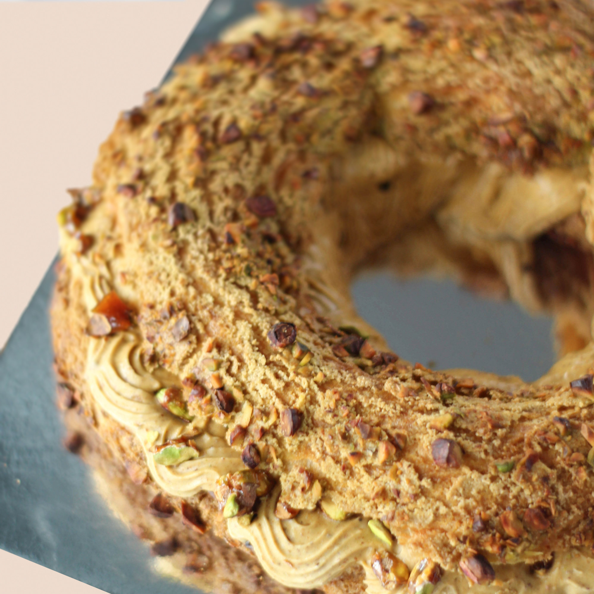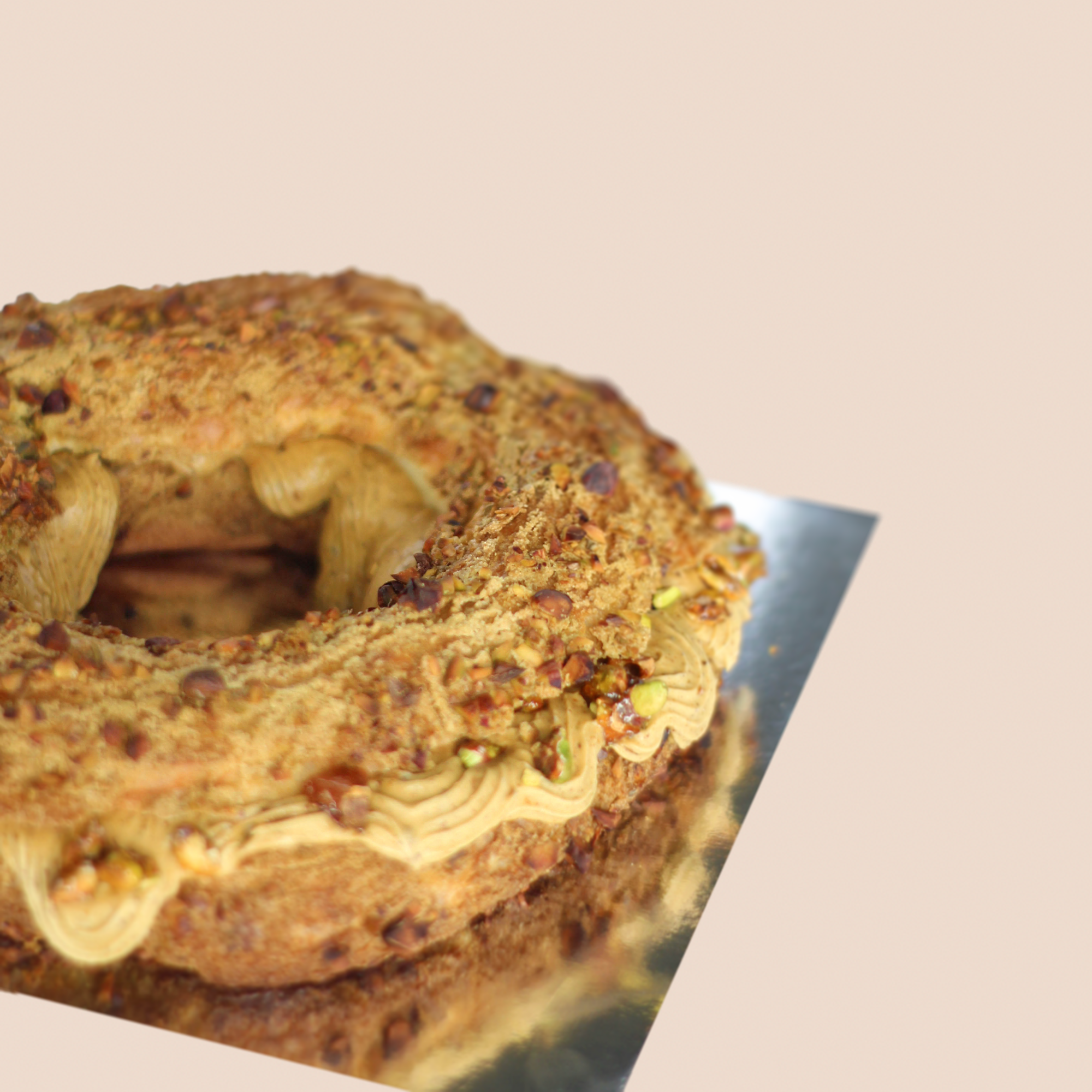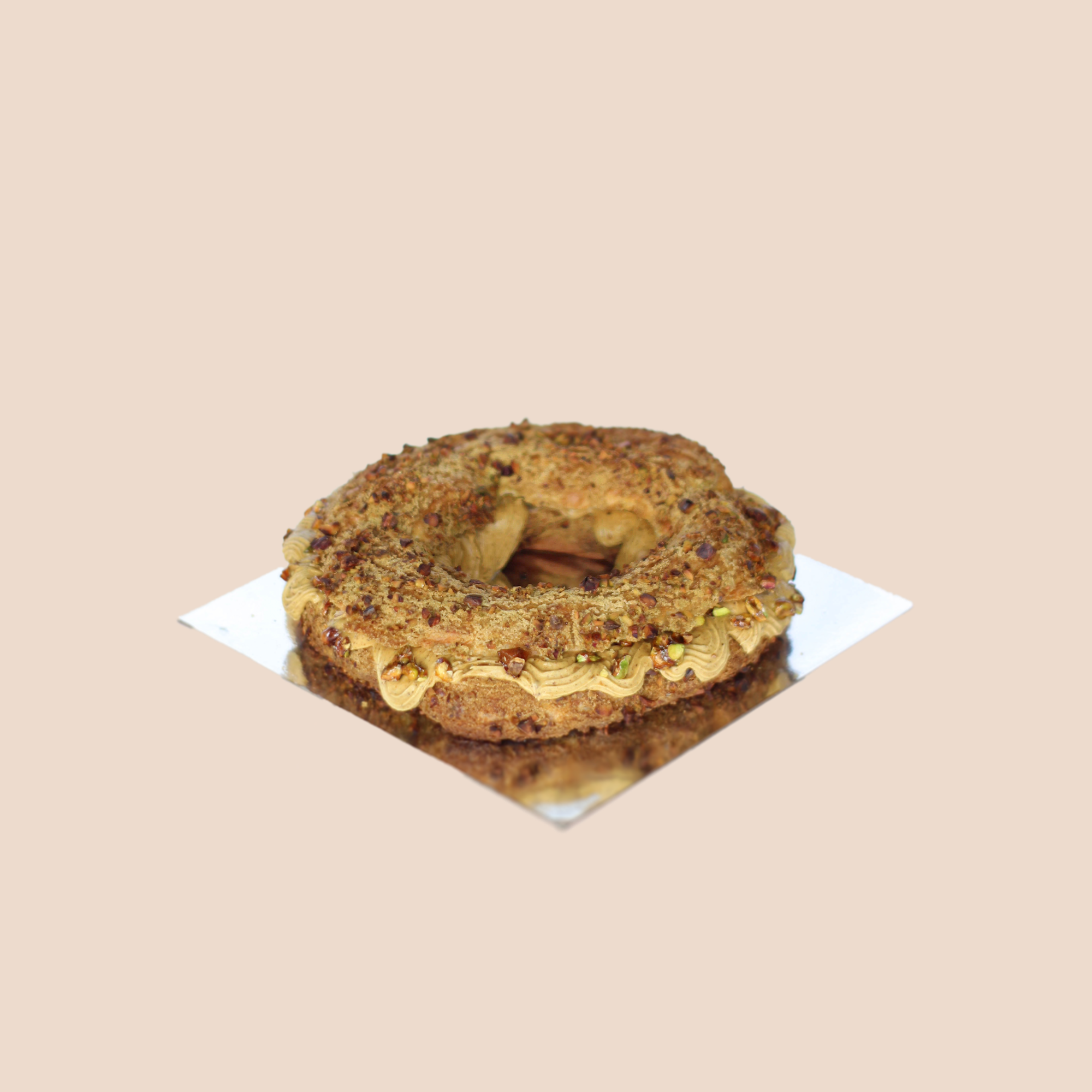 A delicate choux bun filled with crunchy pistachio praline and smooth pistachio mousseline cream, finished with a sprinkle of crunchy candied pistachios. For a personalized touch, choose between vibrant raspberry compote or rich chocolate inserts to complete this nutty, creamy delight.