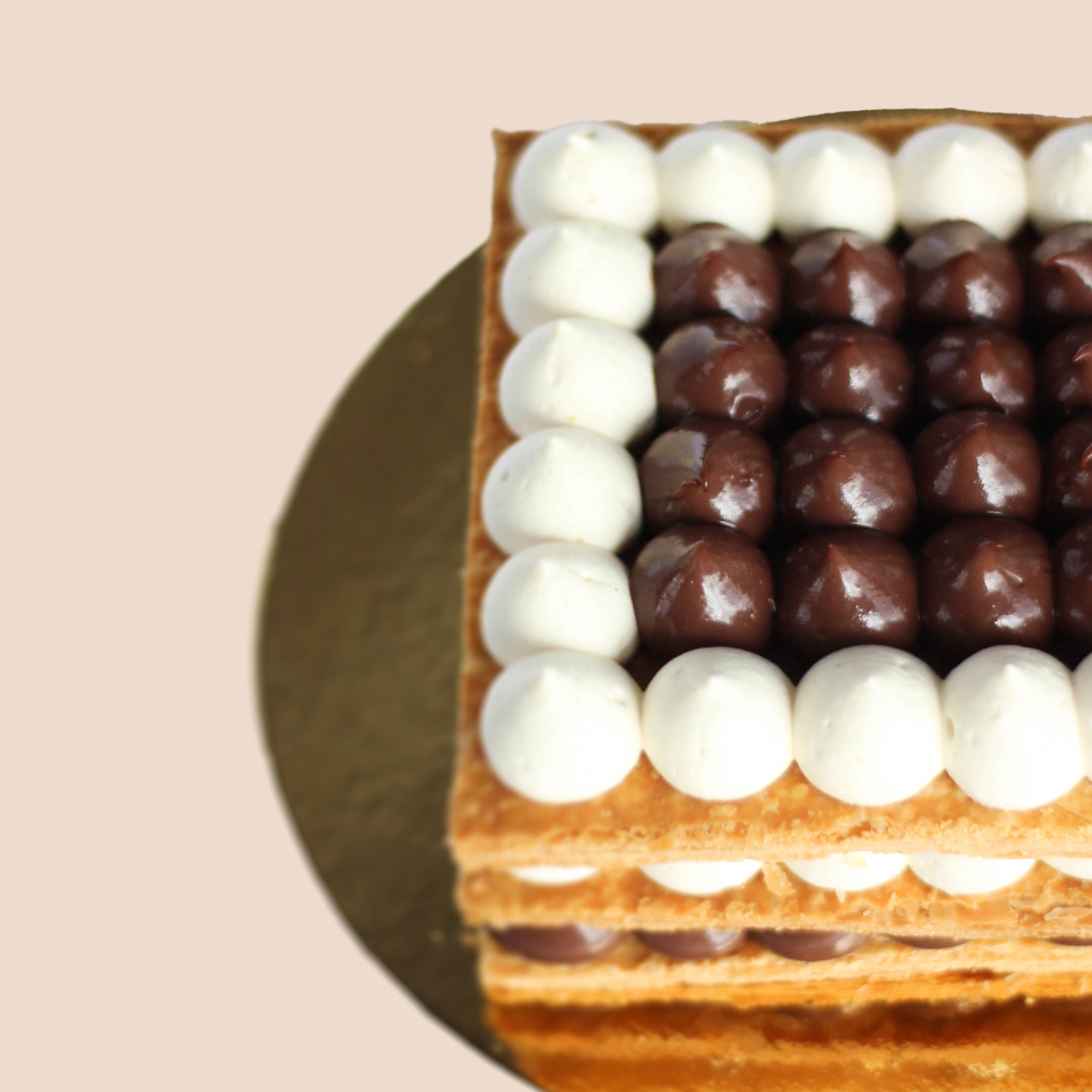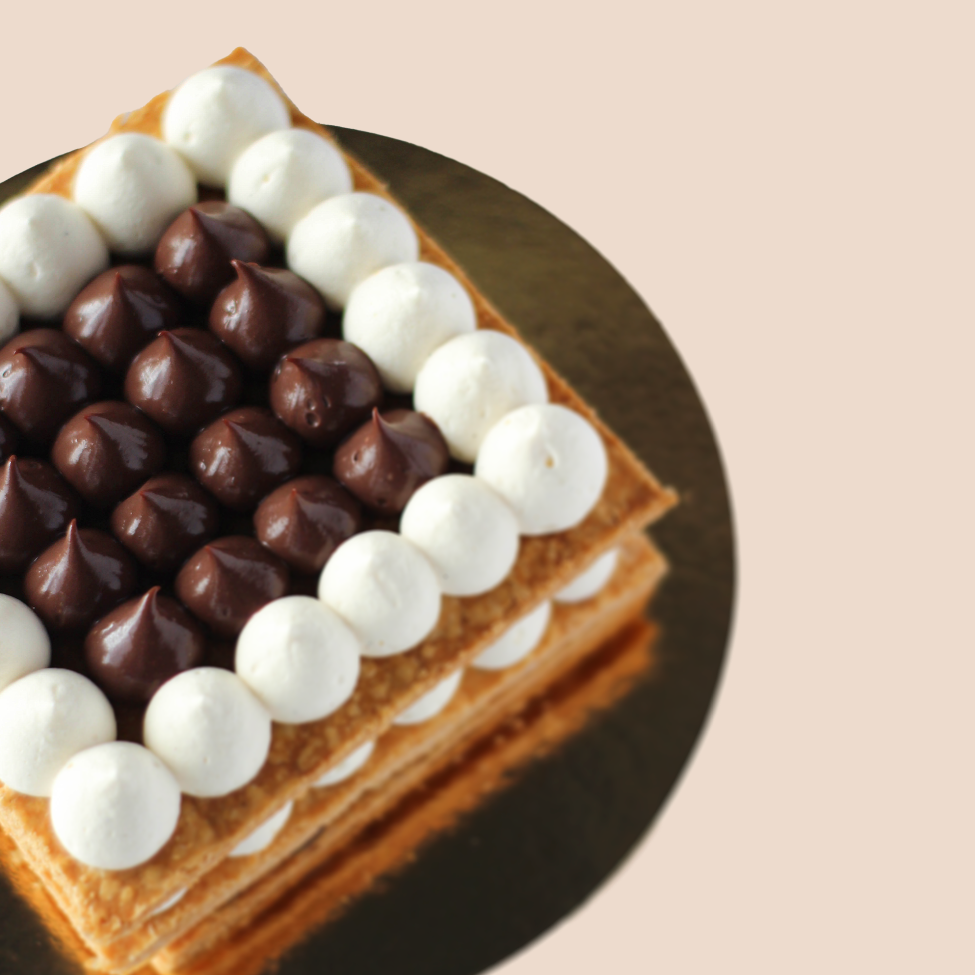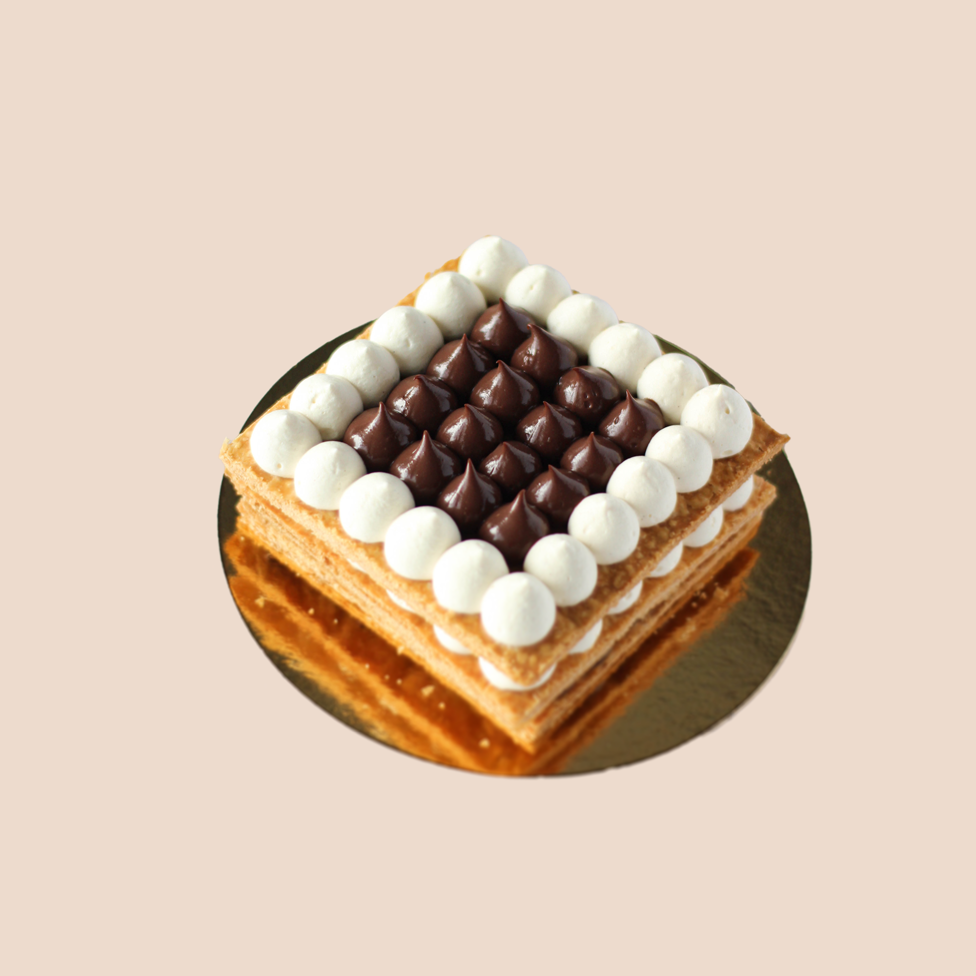 The Fork Tales Mille-Feuille is a celebration of tradition and flavor. Crisp, flaky layers of puff pastry hold a luscious vanilla and lemon diplomat cream paired with juicy Amarena cherries. Rich chocolate cream and chocolate chips add depth and texture, while a delicate Chantilly cream finish brings a light, creamy touch. This dessert is inspired by classic Italian recipes but given a personal twist—crafted with care, creativity, and love to tell a story in every bite.